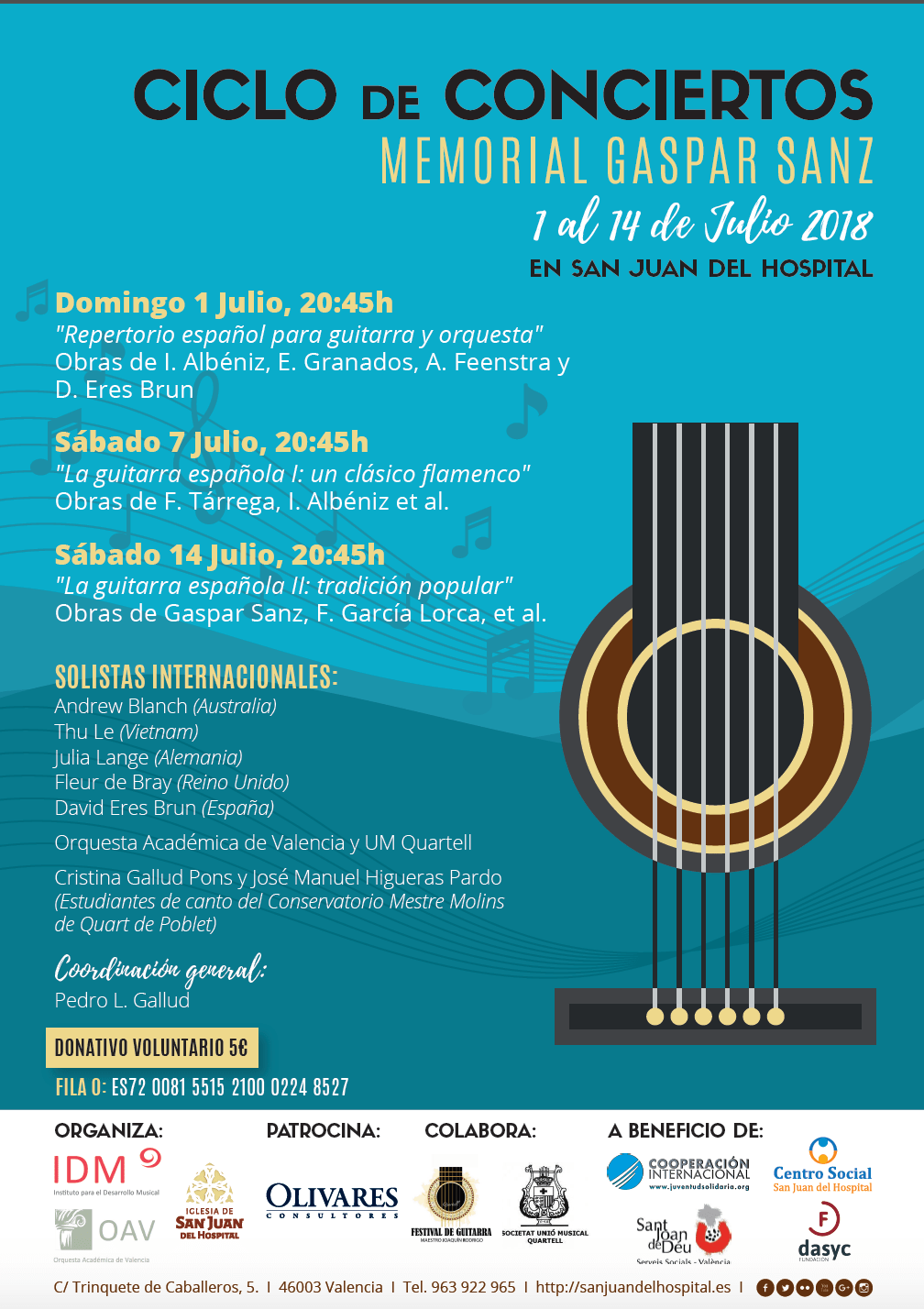 La col·laboració cultural entre Sant Joan de l’Hospital i l’Institut per al Desenvolupament Musical (IDM) fa possible aquest Cicle de Concerts en el marc del Memorial Gaspar Sanz. Mitjançant una tríade de concerts, promouen la posada en valor d’un capítol important del nostre patrimoni cultural i destinen la recaptació d’aquest cicle a entitats socials, una d’elles Sant Joan de Déu Serveis Socials València.